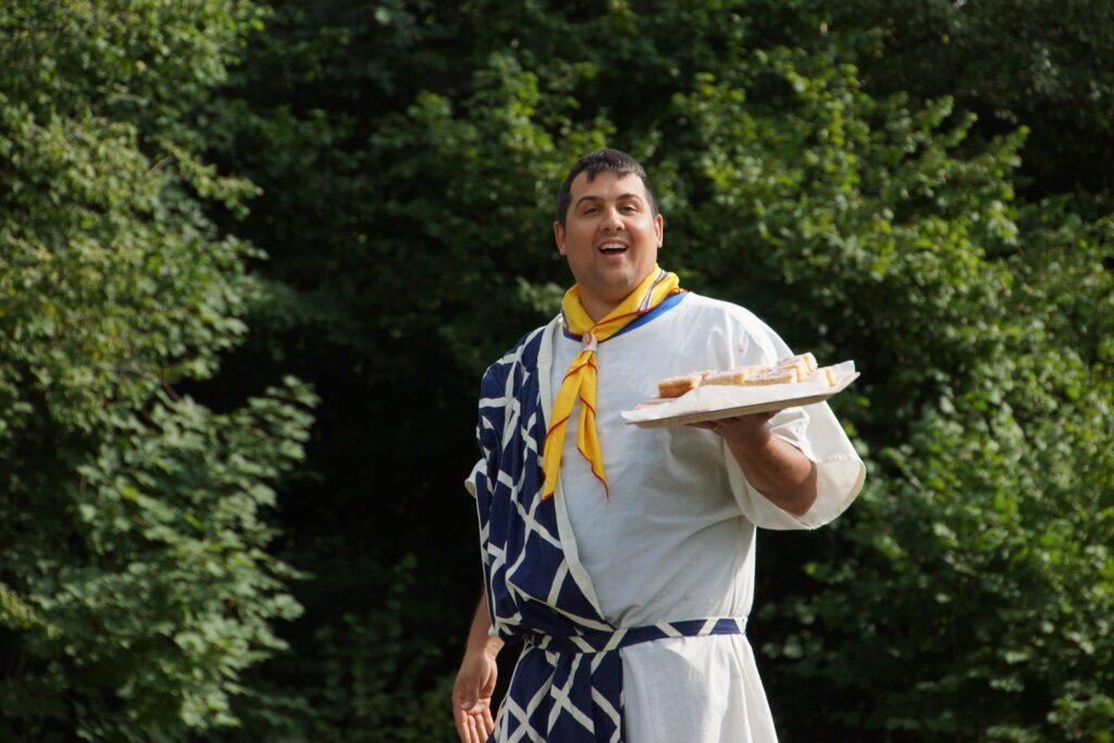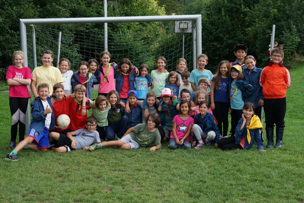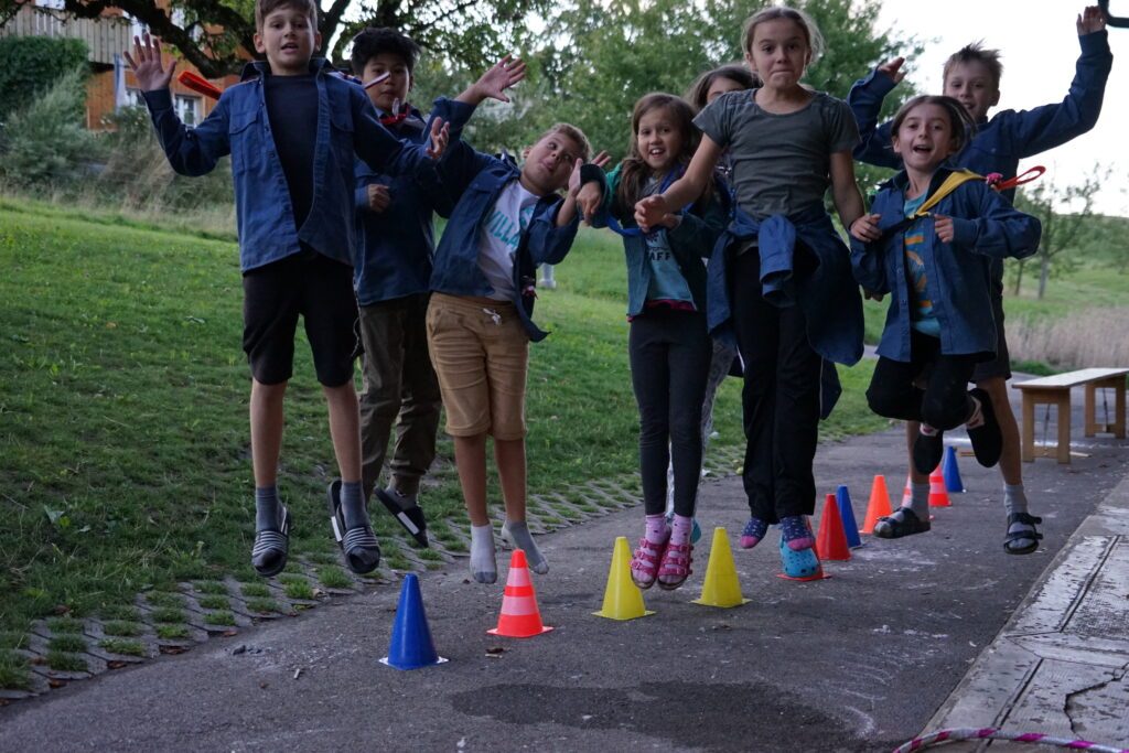 Am 1. August waren typische Schweizer Sportarten dran wie z.B. Schwingen, Steinwurf, Skifahren und OL. Beim Skifahren rannten wir zwischen den Fähnchen hindurch. Als Skihelm diente ein Römerhelm, der uns ständig ins Gesicht rutschte, sodass wir andauernd hinfielen, weil wir nichts mehr sehen konnten.