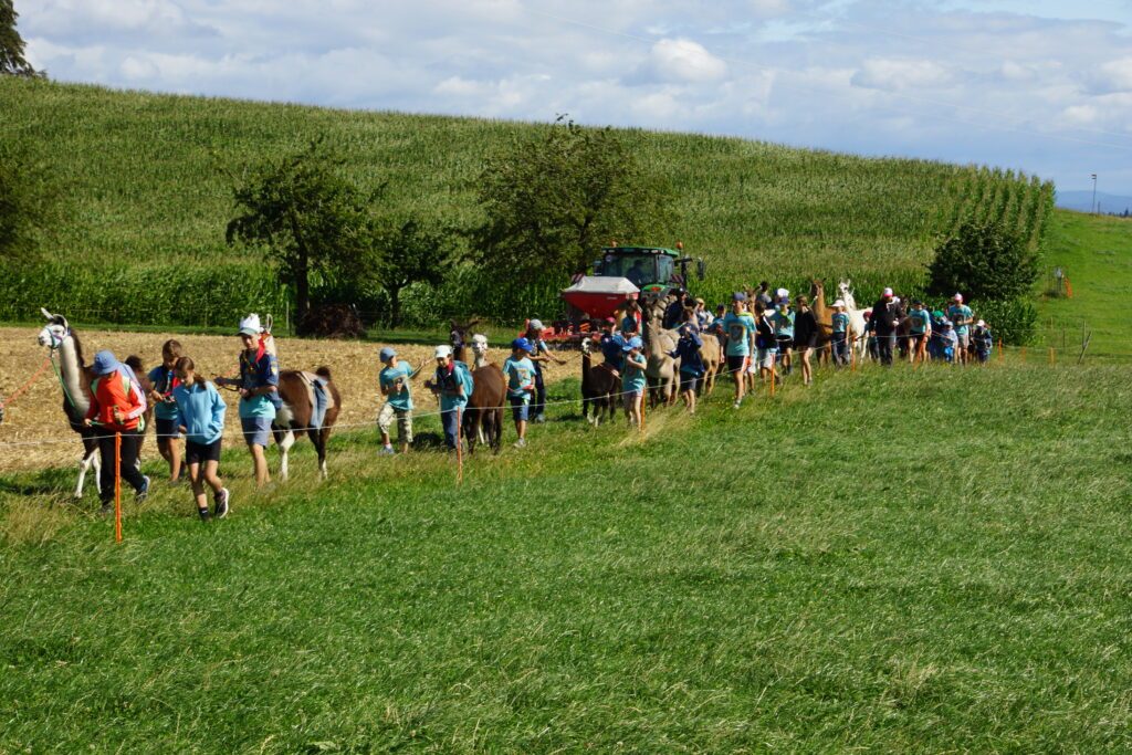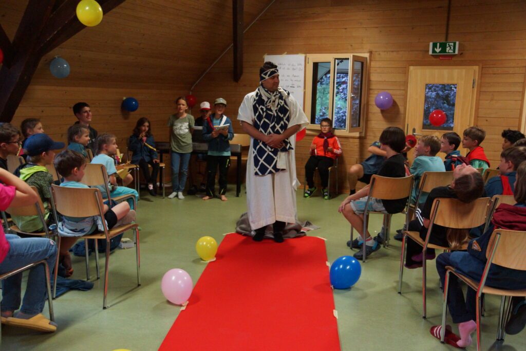 Beim Geländespiel brauchten wir Bändeli, um Stofffetzen, Kleber, Schmuck und Scheren zu kaufen. Damit haben wir einen Königsmantel für David gebastelt. Ein anderes Mal mussten wir gegen das Heer von Absalom kämpfen (das waren die Leiter).